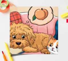 Hunde und Katzen spielen und jagen sich gegenseitig auf einer Wiese. Die leuchtenden Farben und dynamischen Posen vermitteln ein Gefühl von Spaß und Energie.