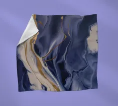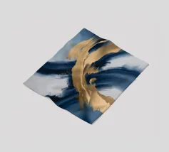 Dieser elegante, abstrakte Hintergrund zeigt fließende Gold- und Silberelemente mit kreisförmigen Akzenten auf einer sattblauen Leinwand und sorgt so für eine beeindruckende visuelle Wirkung, die sich für kreative Projekte eignet.