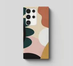 A sophisticated abstract piece with layered, semi transparent shapes in a warm palette of red, pink, and ochre, creating depth and a sense of gentle movement.