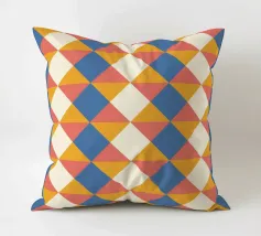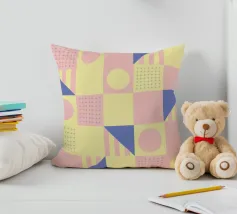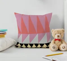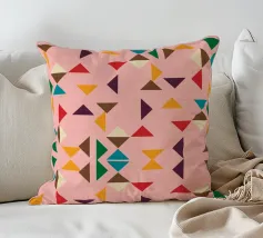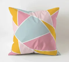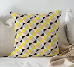 Geometrische Muster wiederholen sich in einem symmetrischen Design, das Dreiecke und Rechtecke in Schwarz, Gelb und Rosa umfasst. Die strukturierte Anordnung schafft eine visuell auffällige und geordnete Komposition.