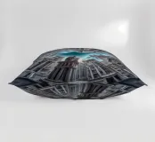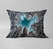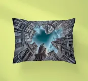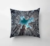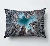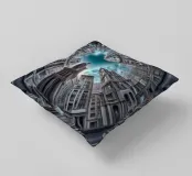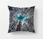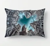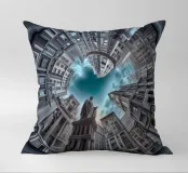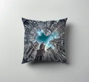 Dieses Bild zeigt eine beeindruckende kreisförmige architektonische Anordnung mit hohen, modernisierten klassischen Gebäuden, die zum Himmel hin konvergieren. Eine prominente Statue in der Mitte verstärkt die dramatische Perspektive unter einem wolkenverhangenen blauen Himmel.