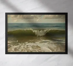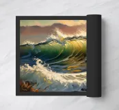 Dieses Ölgemälde fängt die Kraft und Schönheit der Wellen vor der Küste ein. Die gewaltigen Wellen, die sich auftürmen, sind mit kräftigen Strichen in tiefem Blau, Meeresgrün und schäumendem Weiß gemalt und bilden auffällige Kontraste. Das Sonnenlicht wird von der Meeresoberfläche reflektiert, schimmernd und sich ständig verändernd. Das Gemälde weckt ein Gefühl von Freiheit, die Majestät der Natur und die grenzenlose Energie des Meeres.