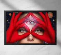 Dieses surreale Kunstwerk zeigt zwei gewandete Gestalten, die Hand in Hand durch einen alten steinernen Torbogen auf einen leuchtenden Himmel in rosa und violetten Tönen zugehen. Über ihnen schwebt ein leuchtendes geometrisches Auge, das Bewusstsein, Geheimnis und tieferes Verständnis symbolisiert. Die Mischung aus historischer Architektur, sanften Farben des Sonnenuntergangs und symbolischer Ikonografie schafft eine Szene voller Bedeutung und Fantasie. Ideal für Fans spiritueller Kunst, surrealer Geschichten und nachdenklich stimmender Wanddekoration, die zu Neugier und Nachdenken anregt.