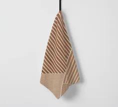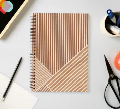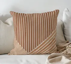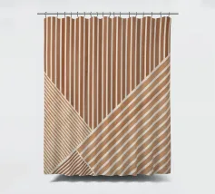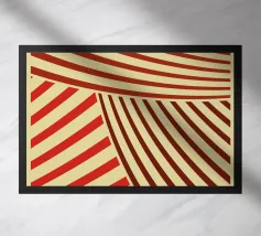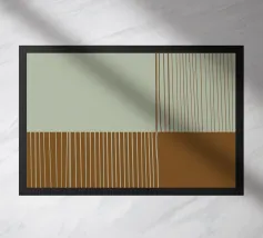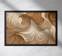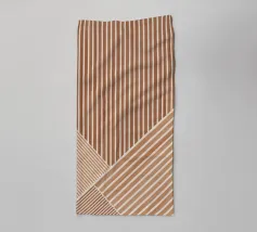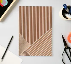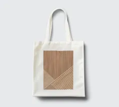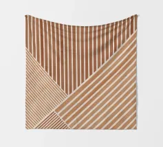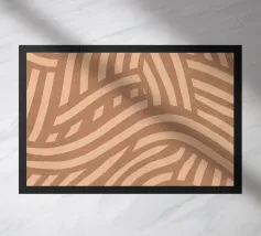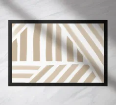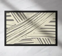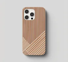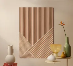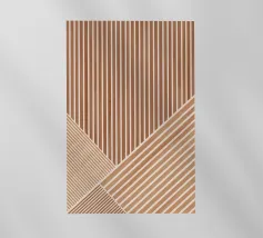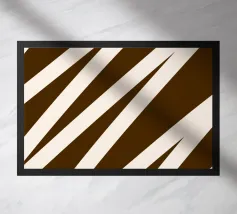 Auffälliges geometrisches Design mit weißen parallelen Linien, die in verschiedenen Ausrichtungen angeordnet sind und dreieckige und trapezförmige Formen vor einem braunen Hintergrund bilden, der an eine Holzstruktur erinnert.