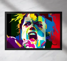 Ein lebhaftes und geometrisches Porträt von Sinead O'Connor im WPAP-Stil mit kühnen, kantigen Formen und einer auffälligen Reihe heller, kontrastreicher Farben. Das Kunstwerk fängt ihre ikonischen Merkmale, wie ihren rasierten Kopf, ihre stechenden Augen und ihren starken Gesichtsausdruck, mit scharfen, fragmentierten Farbblöcken ein. Die Komposition betont Tiefe und Emotionen und behält gleichzeitig die unverwechselbare kubistische Pop-Art-Ästhetik von WPAP bei, wodurch eine visuell dynamische und moderne Hommage an die legendäre Sängerin entsteht.