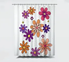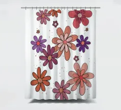 Ein verspieltes Blumenmuster, das wie ein visueller Spaziergang durch ein Retro-Gartenfestival wirkt: Die stilisierten Blüten – in Orange, Pink, Lila, Rot und Gelb – tanzen frei. Jede Blume hat eine einfache, margeritenartige Form mit langen, strahlenförmigen Blütenblättern, die aus einem zentralen Punkt hervorgehen. Die Anordnung ist bewusst unregelmäßig – wie ein Streumuster aus Freude, Sommer und Nostalgie.