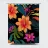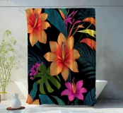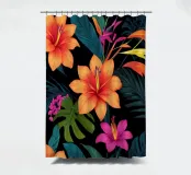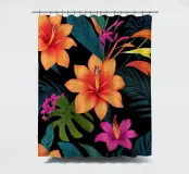 Ein lebendiger Hintergrund mit tropischen Blumen in Orange-, Rosa- und Lila-Tönen, umgeben von üppigen grünen Blättern vor einem dunklen Hintergrund, perfekt als Desktop-Hintergrundbild.