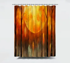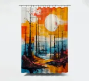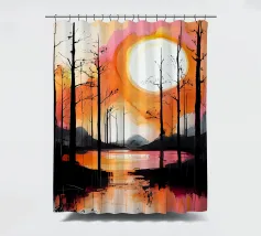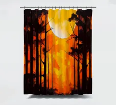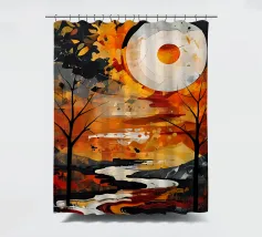 A vibrant and abstract painting capturing the essence of a serene sunset. Bold strokes of orange and blue create a dynamic contrast, while the silhouetted trees and a large, luminous moon add depth and mystery to the scene. This piece is perfect for contemporary spaces seeking a touch of nature and tranquility.