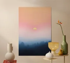 Ein ruhiges und zugleich lebendiges Kunstwerk, das weiche Hügel in frischen Grüntönen und goldgelben Akzenten zeigt. Die Szene erinnert an eine sanfte Morgendämmerung über einer idealisierten Landschaft, perfekt für minimalistische Wohnräume, moderne Drucke oder digitale Anwendungen mit natürlichem Flair.