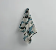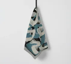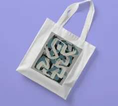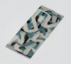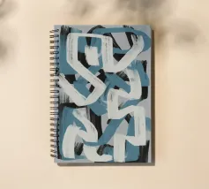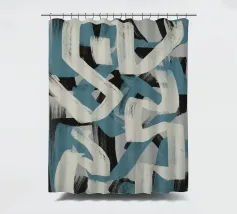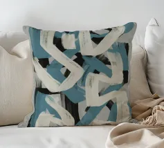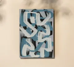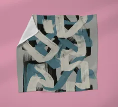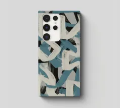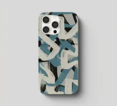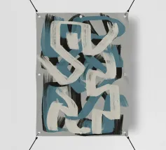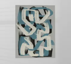 Kühne, ineinander greifende Striche in Blau, Weiß und Schwarz bilden eine abstrakte Komposition vor einem neutralen Hintergrund. Die sich überschneidenden Formen und dynamischen Linien vermitteln ein Gefühl von Bewegung und Energie.