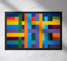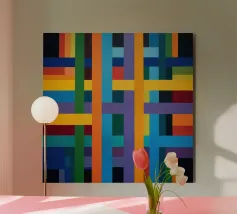 Ein mitreißendes Farbfeuerwerk in strengster Geometrie! Flache, messerscharf geschnittene Balken in leuchtendem Spektrum (von Kobaltblau bis Sonnengelb und Tiefviolett) tanzen über die Leinwand wie ein digitaler Bauhaus-Traum, von Frank Stella, Josef Albers und der Hard-Edge-Malerei der 60er/70er inspiriert. Jede Kante ist perfekt, jede Farbe singt, es entsteht ein vibrierender Rhythmus, der das Auge nie loslässt. Dieses Bild ist pure Energie und meditative Ruhe zugleich – ein moderner Klassiker, der universelle Verbundenheit ausdrückt und Loft, Büro oder Galerie auf Museums-Niveau hebt.