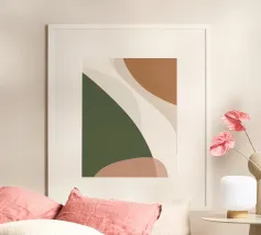 Beruhigendes, minimalistisches Abstraktbild mit fließenden Formen in Salbeigrün und Sandtönen. Elegante zeitgenössische Wandkunst für ruhige, moderne Innenräume.