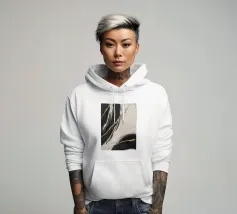 Ein dynamisches abstraktes Kunstwerk, das von schwungvollen Strichen in Grau- und Weißtönen dominiert wird und eine kraftvolle, wirbelartige Bewegung erzeugt. Die monochrome Farbpalette unterstreicht die Textur und den energetischen Fluss der Komposition.