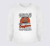 Eine niedliche Wasserschwein-Illustration, umgeben von einem motivierenden Text. Die Worte ermutigen zur Individualität mit einer humorvollen Wendung, die den Charme von Wasserschweinen hervorhebt.
