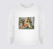 Ein rustikales und warmes Stillleben mit einer Gitarre, einem Krug, einer Wassermelone und Weintrauben. Die Komposition erinnert an ein gemächliches, kreatives Landleben, mit warmen, erdigen Tönen und einer entspannten, harmonischen Anordnung.