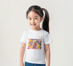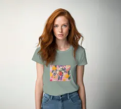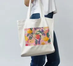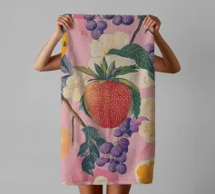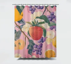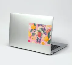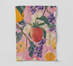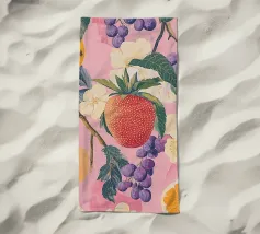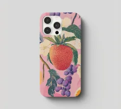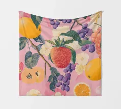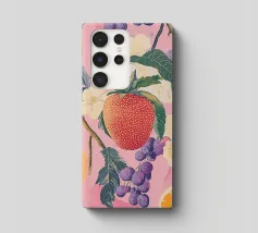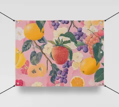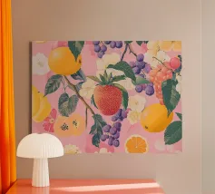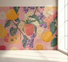 Eine farbenfrohe Collage aus frischen Früchten und Kirschblüten in sanften Pastellfarben, die den Sommer auf einem rosa Hintergrund lebendig werden lässt. Ideal für Obstmarkt-Liebhaber und Naturfreunde!