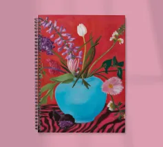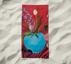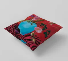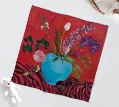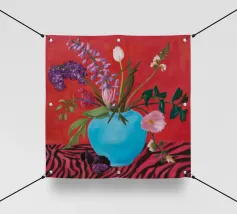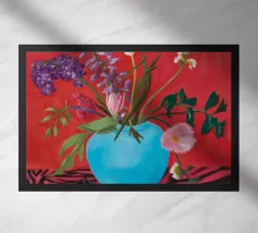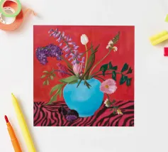 Eine leuchtend türkisblaue Vase birgt einen üppigen Strauß lila, rosa und roter Blumen, die auf einer zebragestreiften Oberfläche vor einem intensiv roten Hintergrund dramatisch platziert sind.