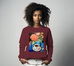 Eine skurrile Illustration einer Tasse dampfenden Kaffees in einer blau-weiß karierten Tasse mit darüber schwebenden stilisierten Blumen vor einem dunkelblauen, gewellten Hintergrund.