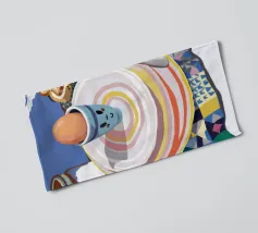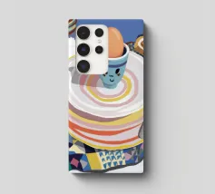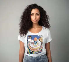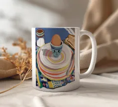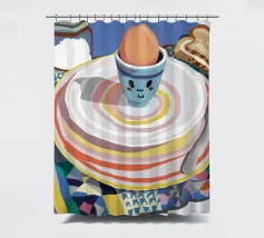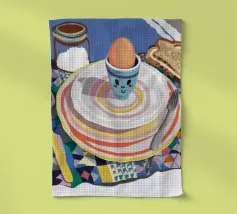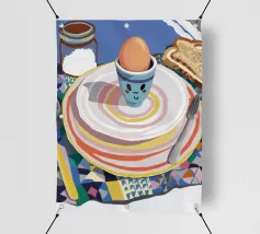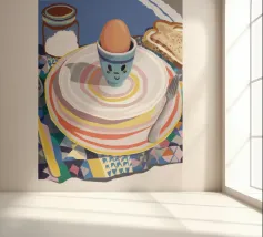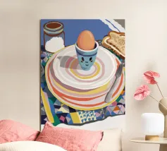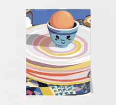 Eine skurrile Frühstücksszene mit einem gekochten Ei in einer Tasse auf einem Stapel von bunt gestreiften Tellern, von oben betrachtet, in einem verspielten, illustrativen Stil.