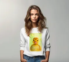 Ein niedliches Entenküken lugt unter einem weichen weißen Handtuch hervor. Seine flauschigen gelben Federn und seine neugierigen Augen schaffen eine bezaubernde und charmante Szene.