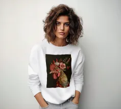 Dieses Kunstwerk zeigt eine Person in einem roten Pullover, die einen Hahn hält. Der Hintergrund ist dunkel und hebt die rustikalen und charmanten Elemente der Szene hervor.