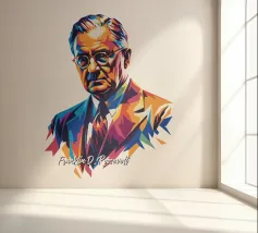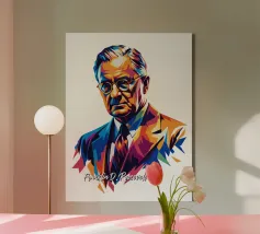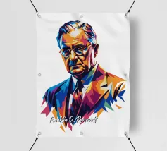 Feiern Sie die Führung und das Vermächtnis von Franklin D. Roosevelt mit diesem lebendigen WPAP Pop Art Design. Mit kühnen geometrischen Formen und einer auffälligen Farbpalette stellt dieses Kunstwerk den legendären US-Präsidenten in einem modernen, abstrakten Stil dar. Die WPAP-Technik (Wedha's Pop Art Portrait) erweckt Roosevelts Bild zum Leben und spiegelt seine Unverwüstlichkeit und seinen transformativen Einfluss in einer entscheidenden Zeit der Geschichte wider. Dieses Design ist perfekt für Geschichts-, Politik- und Kunstliebhaber und stellt eine einzigartige Hommage an einen der einflussreichsten Führer Amerikas dar.