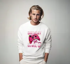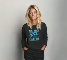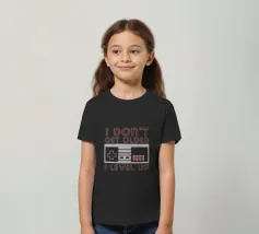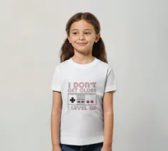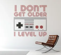 Ein Retro-Gaming-Controller wird von dem Satz "I don't get older, I level up" begleitet, der in einer nostalgischen Schriftart geschrieben ist. Dieses Design kombiniert die alte Spielkultur mit einer humorvollen Sichtweise auf das Altern.