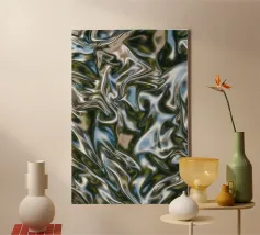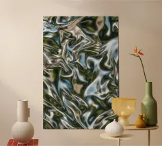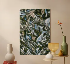 Dieses Poster zeigt einen organisch wirkenden Wirbel aus metallisch glänzenden Flächen in Blau, Grün und Silber – wie ein flüssiger Spiegel der Natur. Die abstrakte Struktur wirkt gleichzeitig digital, organisch und luxuriös. Perfekt für moderne Interiors, Design-Liebhaber:innen und alle, die künstlerische Reflexion in Bewegung schätzen.