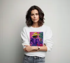 Dieses Kunstwerk zeigt eine Person, die auf einem gestreiften Stuhl sitzt, umgeben von Sonnenblumen und einer grünen Tasche. Der Hintergrund ist ein gedämpftes Braun, das eine rustikale und nachdenkliche Atmosphäre schafft.