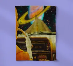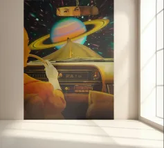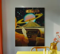 Begeben Sie sich mit Saturn Commute auf ein interstellares Abenteuer. Dieses farbenfrohe und zum Nachdenken anregende Kunstwerk versetzt Sie direkt in eine kosmische Reise, während Sie die berühmten Ringe des Saturns bequem aus dem Innenraum eines Retro-Autos betrachten. Die warmen Farbtöne und das nostalgische Gefühl machen es zu einer idealen Kulisse für alle, die sich nach einem Hauch von Vintage-Weltraumfantasie in ihrem Wohnzimmer, ihrem Büro oder ihrer Spielothek sehnen. Tauchen Sie ein in eine astrale Flucht, bei der zeitloser Stil auf die Unendlichkeit des Universums trifft.