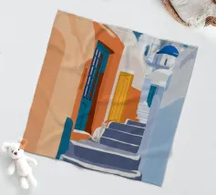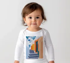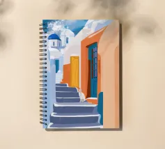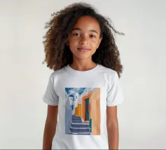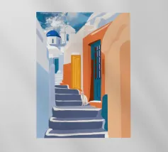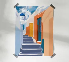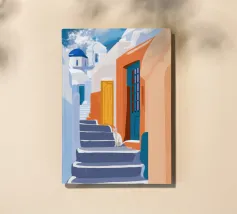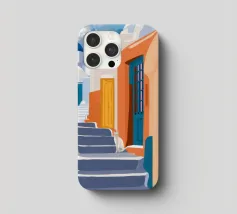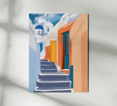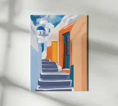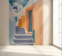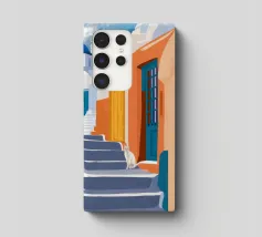 Der Blick über eine schmale, sonnenüberflutete orangefarbene Treppe hinauf zu einem Stück tiefblauen Himmels und einer Tür, die eine warme, einladende und malerische Reiseszene schafft.