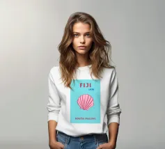 Rosa Muschel mit dekorativem Rahmen auf grünem Hintergrund mit dem Text Shell yeah! Für alle Strandliebhaber!