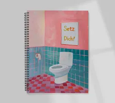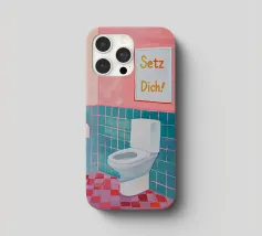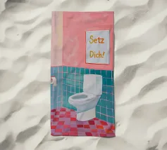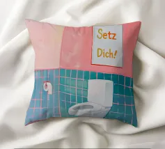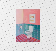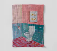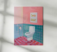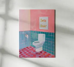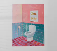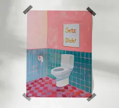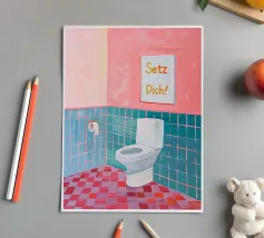 Ein humorvoller Illustrationshinweis für das Gäste-WC: „Setz dich, nicht im Stehen pinkeln!“ – in Pastellfarben und minimalistischem Fliesen Design, perfekt für ein modernes Badezimmer.