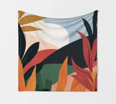 Eine moderne abstrakte Komposition aus verschiedenen stilisierten botanischen Formen und Blättern in einer Palette von Terrakotta, Beige und Dunkelblau vor einem hellen Hintergrund.