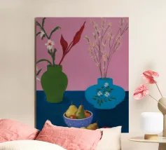 A vibrant still life displays a collection of colorful vases (purple, blue, striped), bowls, and decorative objects artfully arranged on a bright yellow tabletop against a pink and green segmented wall.