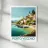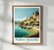 Admire Porto Vecchio through this sun-drenched poster, with its colourful houses perched on the heights, boats resting on calm waters and Mediterranean vegetation. A warm Corsican landscape for a wall decoration full of character and serenity.