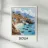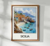 A charming illustration of a coastal village in Sicily, with colourful houses perched on cliffs, boats floating in turquoise water and mountains in the background. A Mediterranean scene that exudes serenity and authenticity, ideal for a sunny wall decoration.