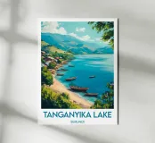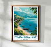 Artistic poster of Lake Tanganyika in Burundi, with its traditional boats, peaceful shores and majestic hills. An ideal wall decoration for travelling without moving.