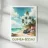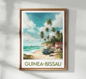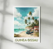 A tropical illustration of a fishing village in Guinea-Bissau, with colourful boats on the beach, red-roofed houses and palm trees leaning towards the ocean. A vibrant, peaceful scene perfect for an exotic wall decoration.