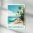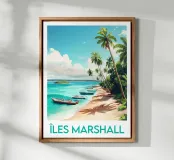 Poster von den Marshallinseln, das einen tropischen Strand mit Palmen und Booten zeigt, die auf einem türkisfarbenen Meer schwimmen. Ein helles und exotisches Bild, ideal für eine Wanddekoration voller Sonne und Gelassenheit.
