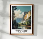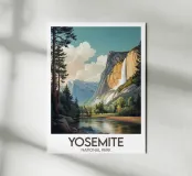 Elegante Illustration des Yosemite-Nationalparks mit seinen berühmten Granitklippen und einem majestätischen Wasserfall, der in ein friedliches Tal stürzt. Ein perfektes Wandposter für alle, die große Naturlandschaften und Wanderungen in der Wildnis lieben.