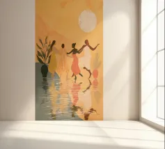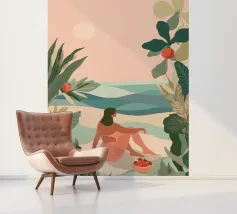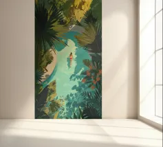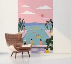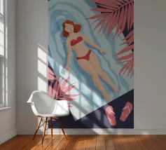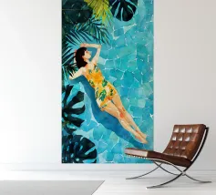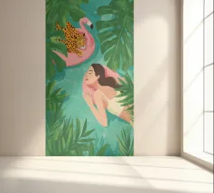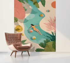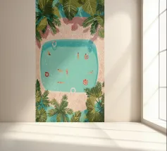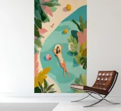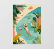 Das Sonnenlicht dringt durch tropische Blätter, während sie friedlich in einem Pool schwimmt und sich völlig entspannt. Die Welt um sie herum verschwindet in sanften Farben und ruhigen Formen - Strandbälle, Sandalen und die Zeit selbst bleiben zurück. Dieses Werk ist ein visuelles Aufatmen und eine Erinnerung daran, innezuhalten, zu atmen und die Ruhe zu genießen.