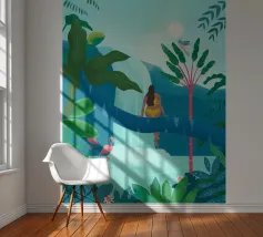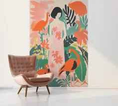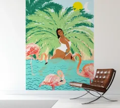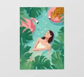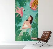 Sie schwebt in einer Welt, in der die Stille blüht - wo Flamingos gleiten, Blütenblätter treiben und sogar ein ruhender Leopard zu träumen scheint. Im Wasser und im Wunder schwebend, wird sie von der stillen Magie eines Moments gehalten, der sich sowohl ungezähmt als auch völlig friedlich anfühlt.