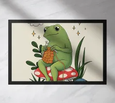 A vivid and whimsical scene featuring a bright pink frog sitting atop a red toadstool with white spots, surrounded by lush foliage and glowing flowers in a misty, enchanted forest. The magical ambiance enhances the surreal beauty.