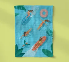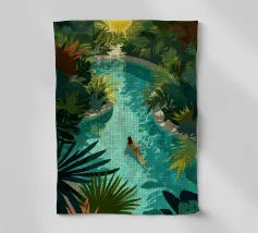 Das Sonnenlicht dringt durch tropische Blätter, während sie friedlich in einem Pool schwimmt und sich völlig entspannt. Die Welt um sie herum verschwindet in sanften Farben und ruhigen Formen - Strandbälle, Sandalen und die Zeit selbst bleiben zurück. Dieses Werk ist ein visuelles Aufatmen und eine Erinnerung daran, innezuhalten, zu atmen und die Ruhe zu genießen.