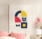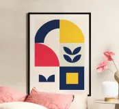 Ein ausgewogenes und ansprechendes abstraktes Poster mit einer gitterartigen Komposition aus geometrischen und organischen Formen. Das Design verwendet eine auffällige, kuratierte Farbpalette aus tiefem Marineblau, leuchtendem Gelb und kräftigem Rot vor einem hellen, cremefarbenen Hintergrund. Zu den Elementen gehören große Halbkreise, ein marineblaues Quadrat, das ein gelbes Quadrat enthält, und stilisierte, blattähnliche organische Formen, die an ein vereinfachtes botanisches oder natürliches Motiv innerhalb des modernistischen Rahmens erinnern. Dieses Kunstwerk verbindet meisterhaft geometrische Abstraktion mit einer spielerischen Ästhetik, die für den Stil der Jahrhundertmitte und des Bauhauses typisch ist. Dieser hochauflösende digitale Download (7000