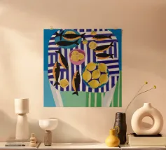 Ein Stillleben mit Zitronen in einer blauen Schale, die auf einem reichhaltigen violetten Tuch ruht. Dahinter steht eine hohe gelbe Vase mit weißen Zweigen vor einem feurig orangefarbenen Hintergrund, der eine kontrastreiche, farbenfrohe Szene erzeugt.