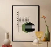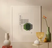Ein raffiniertes und komplexes geometrisch-abstraktes Plakat im Bauhaus-Stil aus dem Jahr 1923. Im Mittelpunkt des Entwurfs steht ein kühnes olivgrünes Sechseck, das von auffälligen horizontalen schwarzen und weißen Streifen und scharfen Dreiecksmustern überlagert wird, die ein Gefühl der dynamischen Bewegung vermitteln. Oberhalb des Sechsecks überschneidet sich ein schwarzes Punktraster (oder eine Halbtonmatrix) mit einer klaren, starren Struktur aus vertikalen und horizontalen schwarzen Linien. Der Schriftzug "BAUHAUS" verläuft vertikal auf der linken Seite. Die Komposition hält ein Gleichgewicht zwischen geschäftigen Mustern und klaren Linien, alles vor einem weichen, blassbeigen Hintergrund. Dieser hochauflösende Digitaldruck (7000x5000 pix