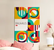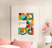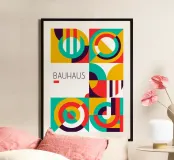 Ein visuell fesselndes Plakat im ikonischen Bauhaus-Stil mit einem Raster aus sechs Quadraten, die jeweils eine einzigartige Anordnung abstrakter geometrischer Formen enthalten. Kräftige Farben - Rot, Gelb, Grüntöne und tiefes Violett - dominieren und bilden Segmente aus Kreisen, Bögen und Streifen. Auf der linken Seite in der Mitte steht in schlanker Typografie "BAUHAUS", was die künstlerische Bewegung unterstreicht. Dieser hochwertige Digitaldruck (7000x5000 Pixel, 300 dpi) bietet eine perfekte Mischung aus moderner Ästhetik und grafischer Präzision und ist damit eine ausgezeichnete Wahl für zeitgenössische Dekoration und Kunstliebhaber, die ein hervorragendes Design suchen