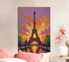 Dieses Ölgemälde ist eine künstlerische Interpretation des Eiffelturms in leuchtenden Orange- und Violetttönen und erweckt die Erhabenheit der Pariser Abende zum Leben. Der Turm erhebt sich majestätisch vor einem reich strukturierten Himmel, während der leuchtende Kanal darunter seine Schönheit widerspiegelt. Die Bäume und Wege rahmen die Komposition ein und lenken den Blick des Betrachters auf das beleuchtete Monument. Dieses Werk ist perfekt für Bewunderer des Impressionismus und Liebhaber von Paris und zelebriert die Verschmelzung von Natur, Architektur und Kunst.
